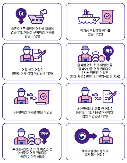 - 신청 연도 직전 연도 기준, 어업 외 종합소득금액이 2천만 원 미만이어야 합니다.