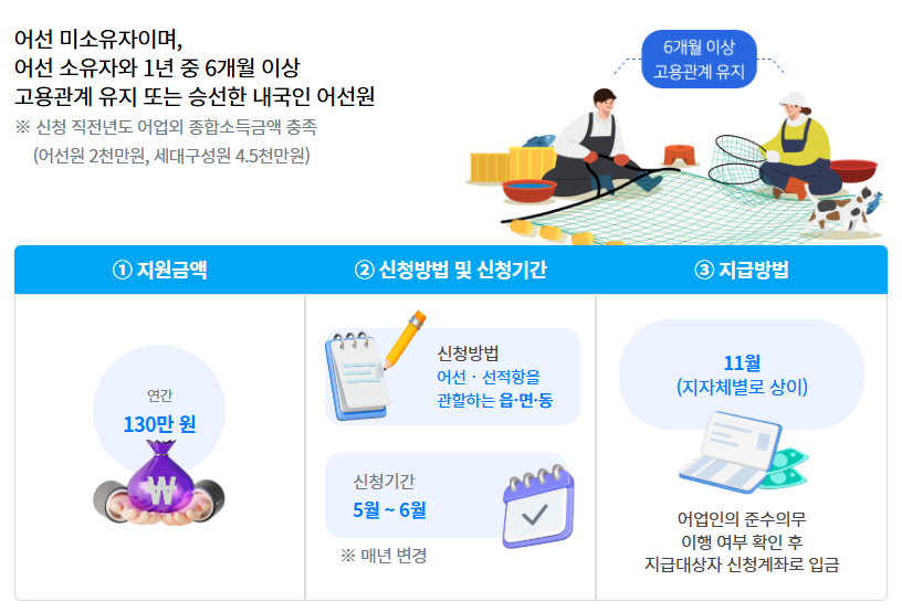 - 지원 금액: 소규모어가 및 어선원 모두 어가(어선원) 당 연간 130만 원